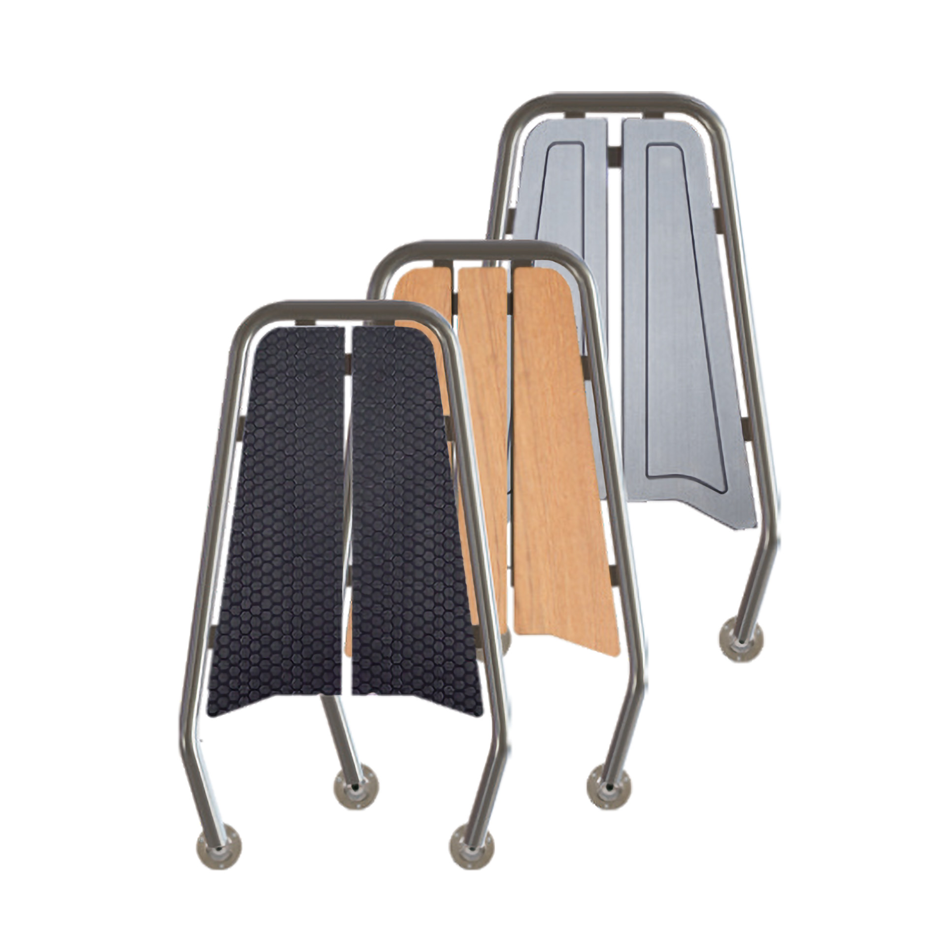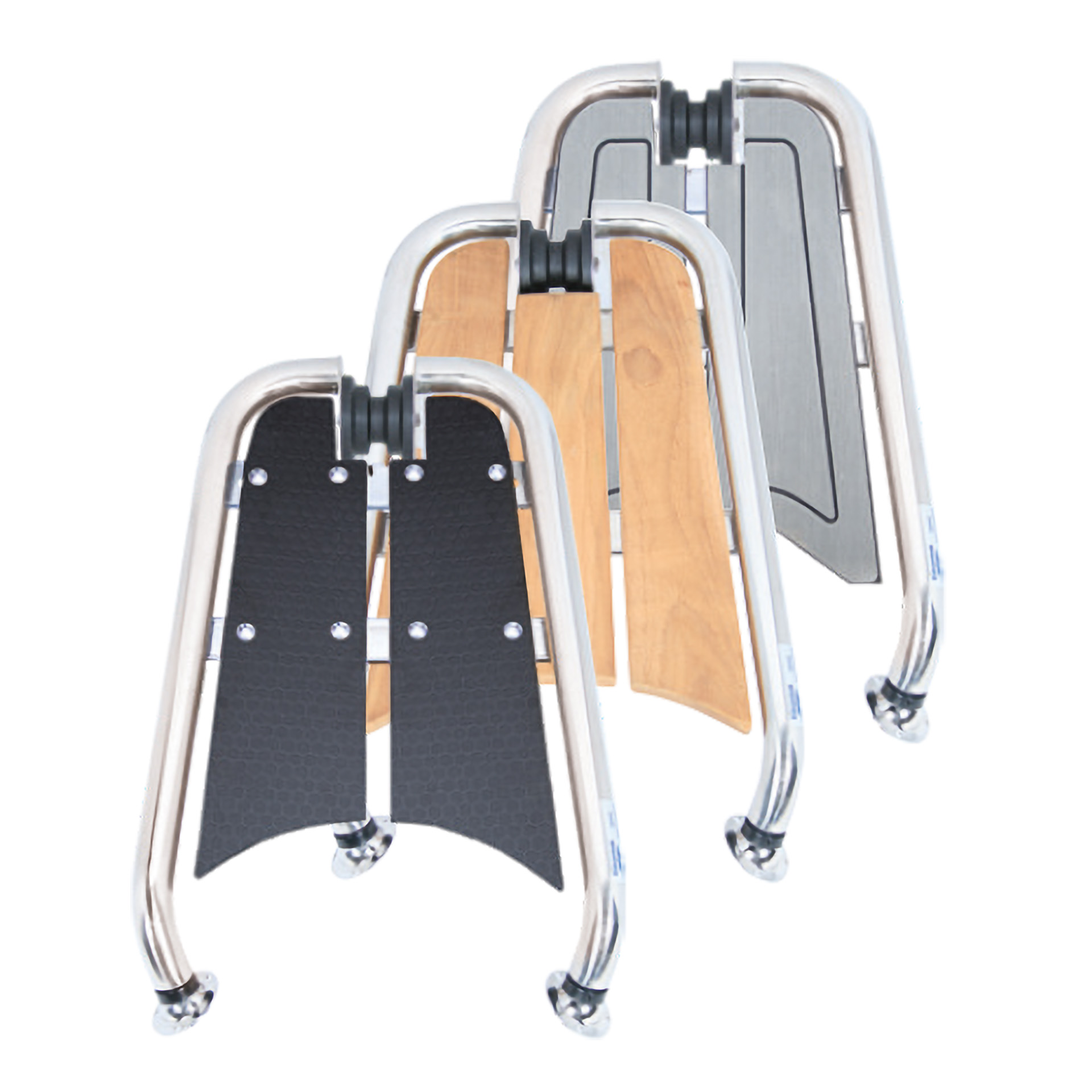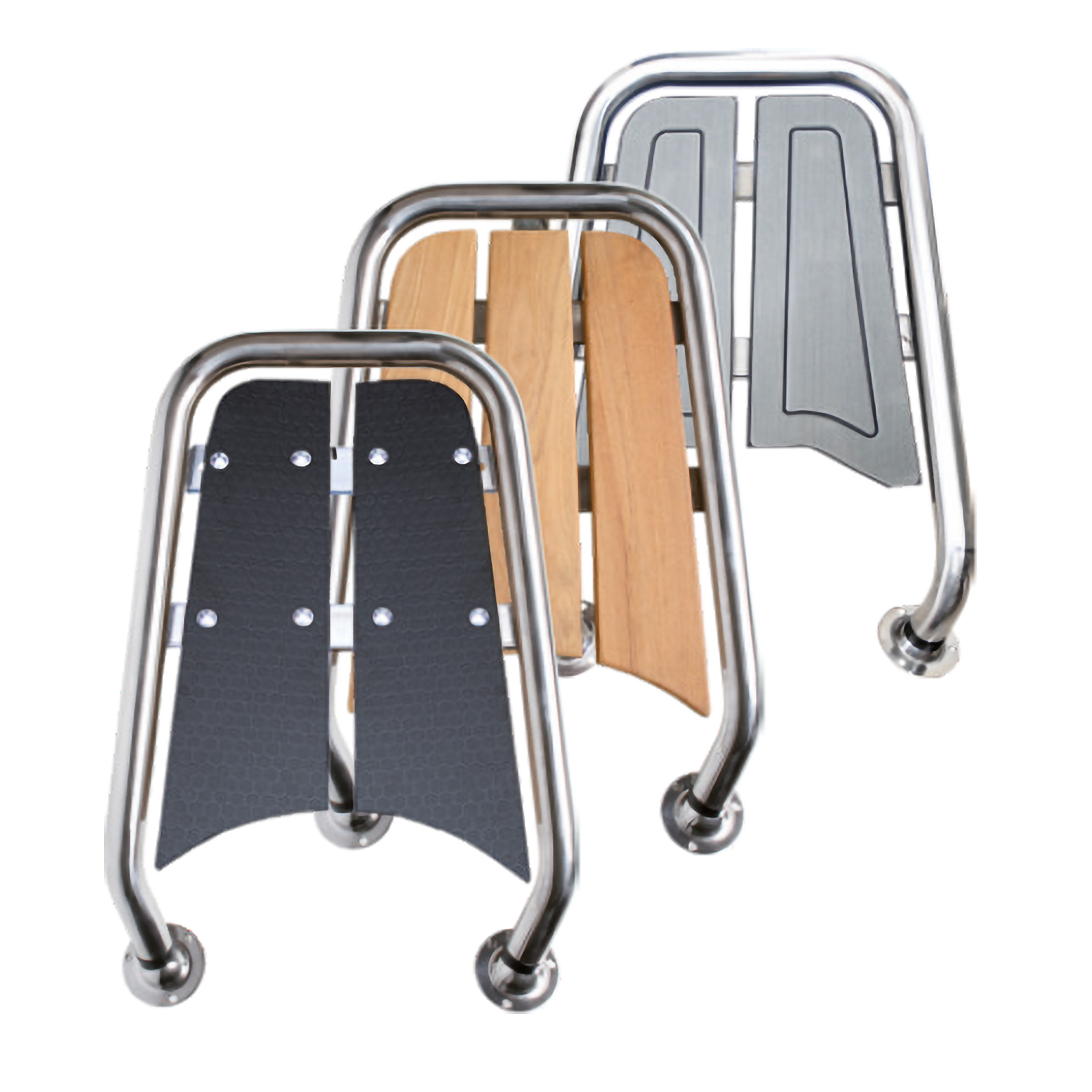 For powerboats between 18 to 25 feet, a ladder in casing or a hook ladder can be added. You can choose between teak, blackline only, or blackline with EVA-decking on top.