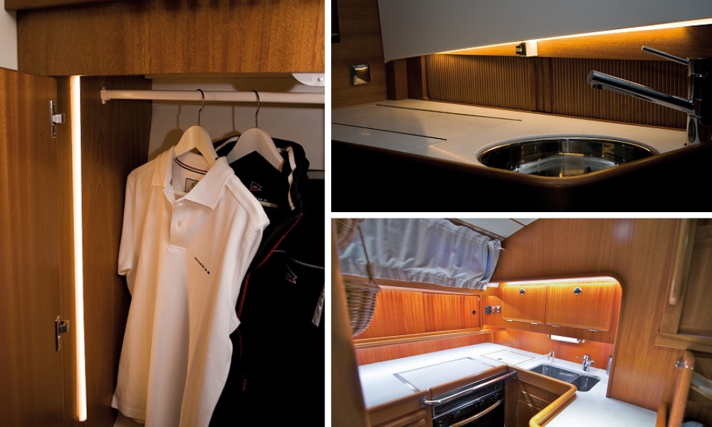 Pay special attention to dark corners and areas. Integrating lighting into cabinets, storage compartments, or along bulkheads eliminates those dark “holes” and enhances the sense of space. Since LEDs generate minimal heat, they’re ideal for installation in small, enclosed spaces.